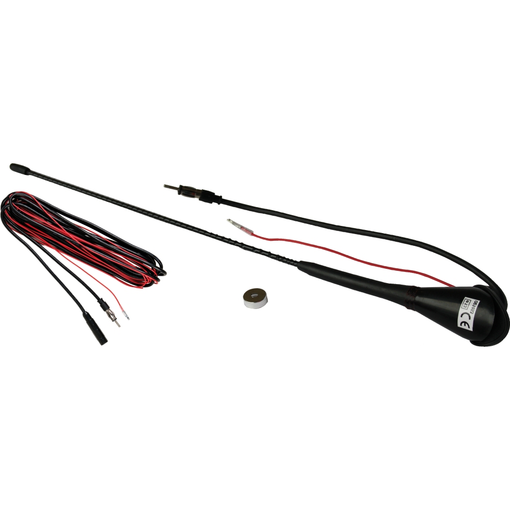 Mit Verstärker FM 10 dB - AM 16 dB, abschraubbarer, gewickelter Stab mit Zwischenringen in Chrom und Schwarz. Steckanschluss kurz - Kabellänge 450 cm, Stablänge 49 cm