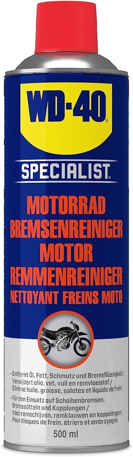WD-40 Specialist Motorbike Bremsenreiniger Dieses Produkt entfernt Schmutz, Ablagerungen, Öl und Brems-flüssigkeit von Bremsen und Kupplungssystemen. Die schnell wirkende Formel trocknet in Minuten ohne Rückstände zu hinterlassen. Eine regelmäßige Reinigung trägt zum längeren Erhalt von Bremsscheiben und Bremsbelägen bei. IHRE VORTEILE: Erhält die Bremsleistung und reduziert Geräusche Schnelltrocknend Verlängert die Lebensdauer von Bremsscheiben und Bremsbelägen Gebrauchsanweisung: Nur an gut belüfteten Orten verwenden. Sprühen Sie das Produkt auf Bremsscheiben, Bremsbeläge und Kupplungen, um den Schmutz zu entfernen. Kontakt mit Kunststoff, Gummi oder Lack vermeiden. Spray kurz verdunsten lassen und verbleibende Reste mit einem sauberen Tuch abwischen. Bremsen nach der Reinigung immer testen. WD-40 SPECIALIST MOTORBIKE Jetzt neu – Die WD-40 Specialist Motorbike Produktserie ist speziell für die Anforderungen aller Motorradfahrer, -schrauber und -mechaniker entwickelt worden. Pflegen Sie ganzjährig Ihr Motorrad mit den Produkten dieser neuen Serie und vertrauen Sie dabei auf die bekannte WD-40 Qualität.