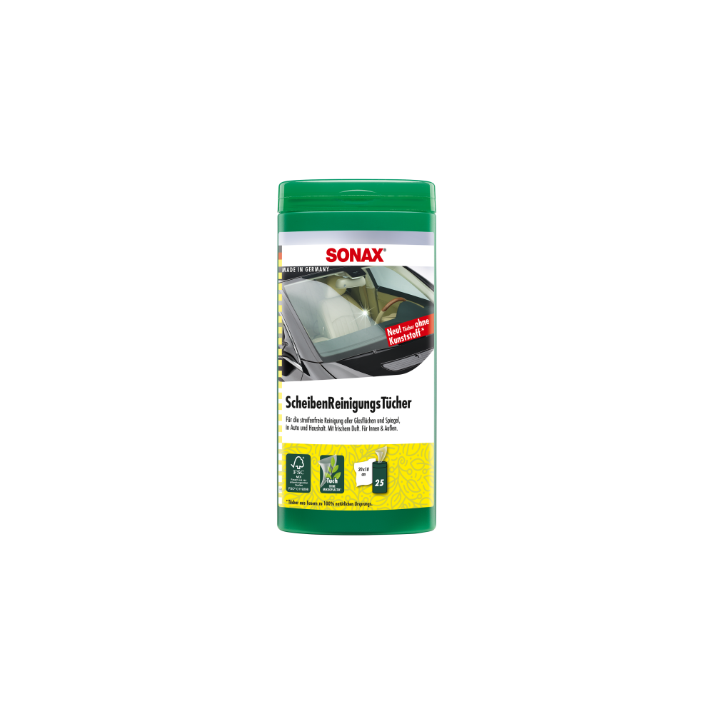 Die hochwertigen, griffigen SONAX ScheibenReinigungsTücher in Verbindung mit speziellen Reinigungskomponenten bringen streifen- und schlierenfreie Sauberkeit. Geeignet für die schnelle und gründliche Reinigung aller Glas- und Spiegelflächen im Auto und Haushalt. Auch auf getönten Scheiben einsetzbar. deal für unterwegs und zwischendurch. Mit frischem Duft.